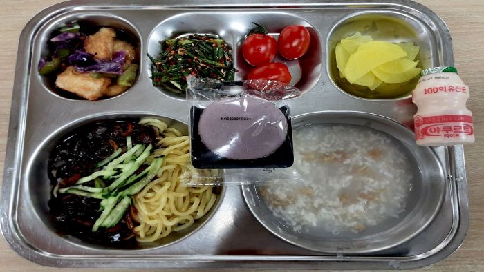 자장면* (1.5.6.10.13.16)대추방울토마토* (12)딸기마카롱* (1.2.5)자율-누룽지탕(숭늉) 자율-쪽파액젓무침 (5.6.13)단무지(얇은)* 찹쌀꿔바로우/소스* (1.5.6.10.13)요구르트(65ml)* (2)
