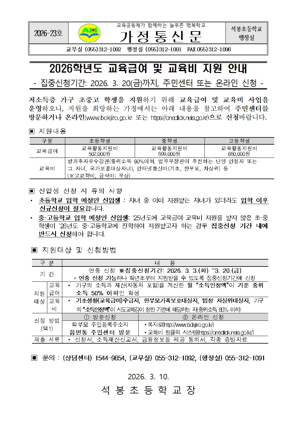 2026학년도 교육급여 및 교육비 지원 안내 가정통신문 입니다.