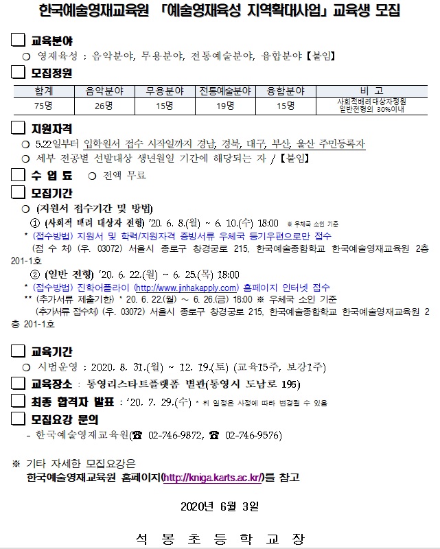 (2020-043) 한국예술영재교육원 「예술영재육성 지역확대사업」교육생 모집