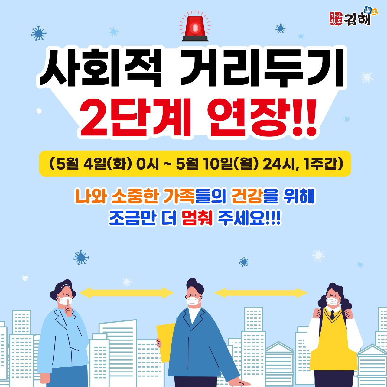 사회적 거리두기 단계가 연장되고 도내 코로나19 확진자가 지속 발생하고 있으나 5월 가정의 달을 맞아 많은 이동이 예상됩니다. 휴일 및 휴업일 기간에도 학생·교직원·학부모님께서는 외출시 언제 어디서나 마스크 착용, 5인 이상 사적모임 금지, 밀집·밀접촉 우려가 있는 시설 출입 자제, 중점·일반관리시설 집합제한(행정명령) 등 거리두기 단계에 따른 방역수칙을 적극적으로 준수해주시고, 마스크 올바른 착용(코와 입 막기), 손 씻기(30초 이상) 등 우리 학생들이 개인위생수칙을 잘 지키며 건강하게 휴일을 보낼 수 있도록 가정에서도 지도 부탁드립니다.