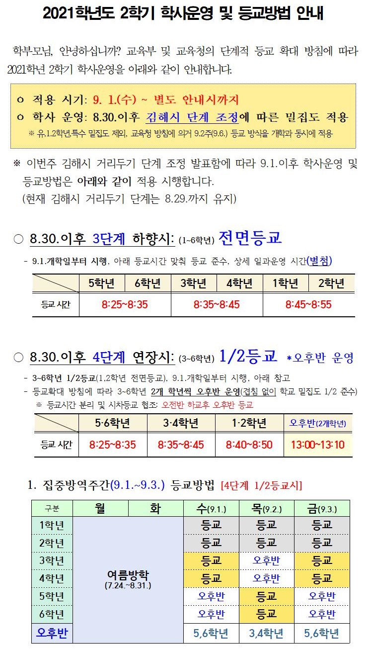 http://seokbong-p.gne.go.kr/seokbong-p/na/ntt/selectNttInfo.do?nttSn=85835772&mi=75365 ● 보호자 동반 교외체험학습 연간 일수 확대(9.1.부터): - 수업일수 20%인 38일에서 30%인 57일로 확대 - 단 기존일수(15일)보다 초과된 일수는 감염병 위기경보 단계가 '심각' 또는 '경계'인 경우로, '가정학습' 목적인 경우에 한함