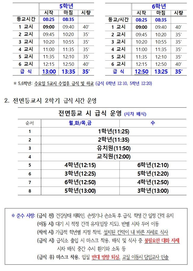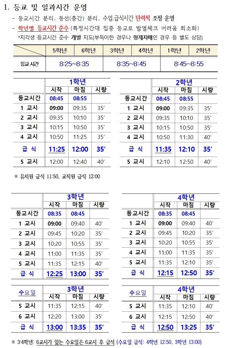 ○ 적용 시기: 9.1.(수)부터 별도 안내시까지 ○ 학사 운영: (1~6학년) '전면등교' ※ 등·하교·수업·급식 등 탄력적 시차 운영, 공간·층별 분리 등 전면등교에 대응 방역수칙 강화