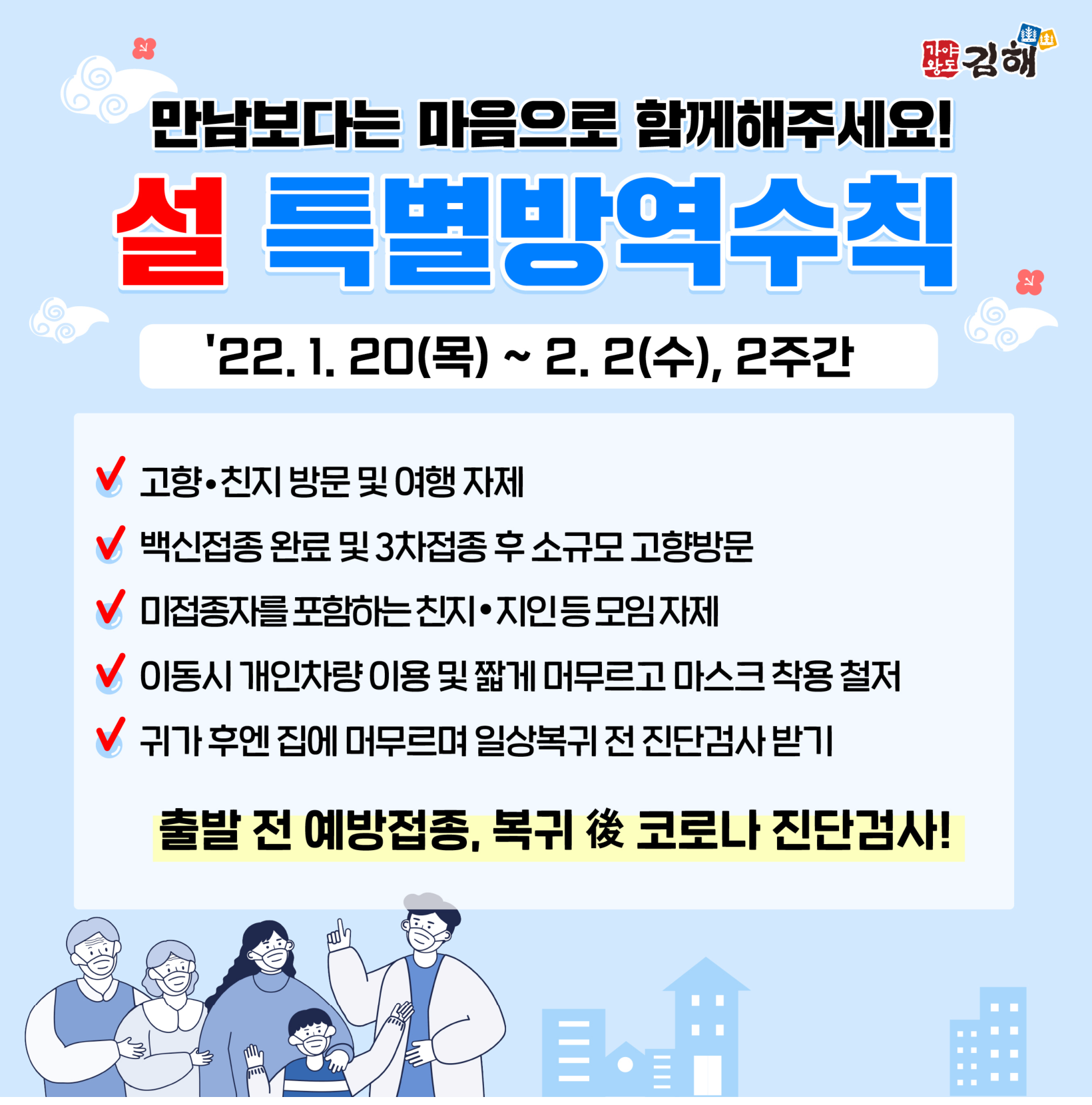 ㅇ (학생 및 전교직원) '설 연휴 특별방역대책' 적극 준수 - 고향 친지 방문 및 여행 자제, 음식물 섭취 시 거리유지 - 친지방문 자제: 불가피한 경우 백신접종 및 3차 접종후 '핵심방역수칙' 준수, 소규모 방문 권고 ▶ 참석인원 및 체류시간 최소화, 밀집장소 출입 자제, 어르신 만날 때 반드시 마스크 착용 등 - 개학전 여행 자제: 불가피한 경우 방문시설 방역관리지침 준수, 가족단위 소규모로 다른 일행과 거리두기 등 - 사적모임 및 다중이용시설 운영시간 제한 준수 - 설 연휴 기간 동안 학생 및 교직원 '건강상태 자가진단' 매일 실시, 다중이용시설 이용 자제 - (중요) 개학전, 연휴 마지막 날(2.2.수) 학생 및 교직원(동거가족 포함) 임상증상 유무 점검 (코로나19 관련 특이사항 발생시 지체없이 연락) - 설 연휴기간 모든 학교 종사자 솔선하기 ㅇ의심증상이 있거나 친지 등 다수 밀접 접촉한 경우 선별진료소 등에서 진료.검사 받기 ▶ (60세 이상, 고위험군) 선별진료소에서 PCR검사, 확진 시 먹는 치료제 등 조기 치료 ▶ (일반) 가정.지정의료기관.선별진료소에서 신속항원검사(양성→PCR), 확진시 재택치료