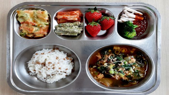 육개장* (1.5.6.9.16)브로콜리,오징어숙회/초고추장* (5.6.13.17)자율-궁채들깨볶음 (5.6)딸기* 배추김치* (9)통밀쌀밥* (6)감자채피망치즈구이* (2)