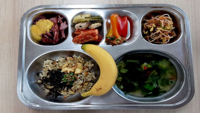 전복영양밥+부추양념장 (2.5.6.18)단배추된장국* (5.6.9)콩나물파채무침 (5.13)오리훈제구이/머스터드소스 (1.5.6.13)배추김치* (9)바나나* 자율-삼색파프리카스틱/쌈장 (5.6)
