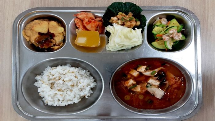 귀리밥* 참치김치찌개* (5.6.9)체다치즈함박스테이크/소스* (1.2.5.6.10.12.13.16)망고푸딩 애호박나물* (9.13)알타리김치 (9)자율-양배추,케일/강된장 (5.6)