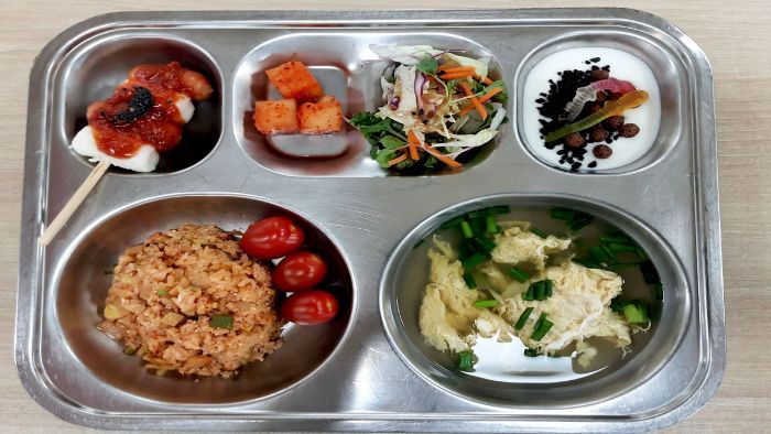 달걀실파국* (1.5.6.9)소떡소떡오븐구이* (1.5.6.10.12.13.16)깍두기* (9)대추방울토마토* (12)토핑요거트(초코크런치)* (2.5.6.10)자율-어린잎양상추샐러드 (5.6.13)날치알김치볶음밥* (5.9)