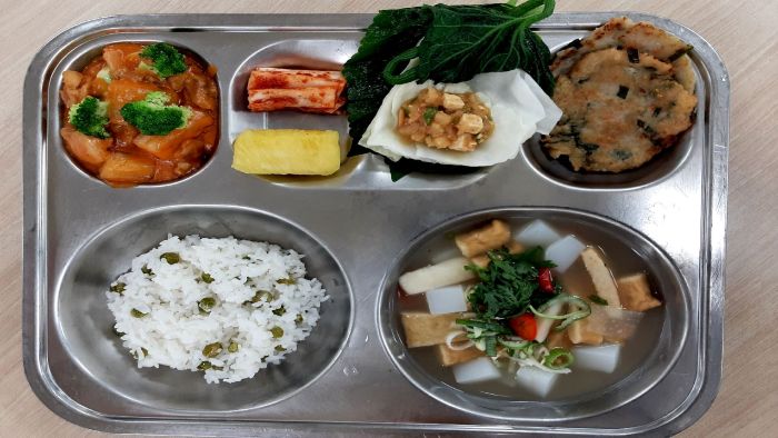 햇완두콩밥* 모듬어묵국* (1.5.6.9.13)로제분모자닭갈비* (2.5.6.12.13.15.16.18)연근전* (6)골드파인애플* 배추김치* (9)자율-모듬숙채&강된장 (5.6)