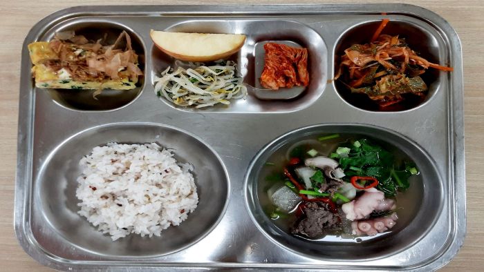 오색발아현미밥* 쫄면채소무침* (5.6.13)연포탕* (5.6.9.16.18)자율-숙주쑥갓무침* 오코노미치즈계란말이* (1.2.5.6.12.13)배추김치* (9)사과*