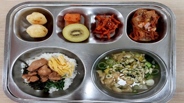 치킨데리야끼덮밥 (1.5.6.13.15.18)유부장국* (1.2.5.6.9)자율-묵은지김치찜 (9)진미채볶음* (1.5.6.13.17)깍두기* (9)알감자허니버터구이* (2.13)골드키위*