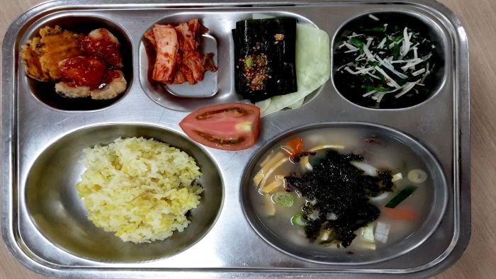 강황밥* 별속떡국* (1.5.6.9.16)팽이버섯부추무침* (5.6)코다리순살강정&벌집고구마칩* (5.6.12.13.15.18)달콤꿀토마토 (12)배추김치* (9)자율-양배추,다시마쌈 (5.6)