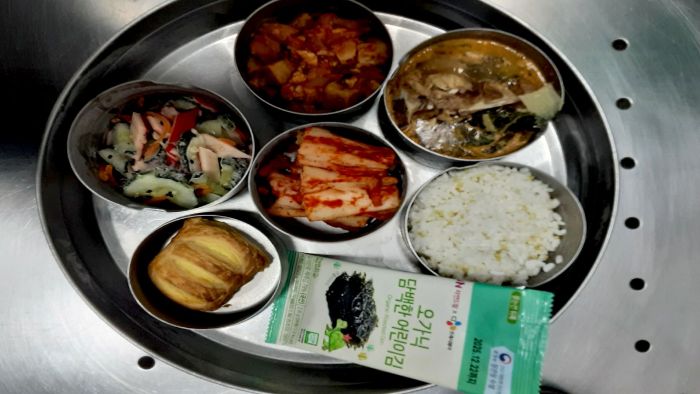 기장밥* 돈등뼈우거지탕* (5.6.9.10)오이맛살새콤무침* (13)미니슈크림파이오븐구이* (1.2.5.6)유기농김* 배추김치* (9)소고기마파두부* (5.6.12.13.16.18)
