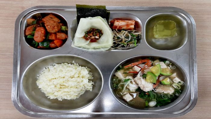 강황밥* 꽃게된장국* (5.6.8.9)미트볼비엔나소시지케첩조림* (1.2.5.6.10.12.13.15.16)숙주부추무침* (5.6)사과푸딩 배추김치* (9)자율-양배추,다시마쌈 (5.6)