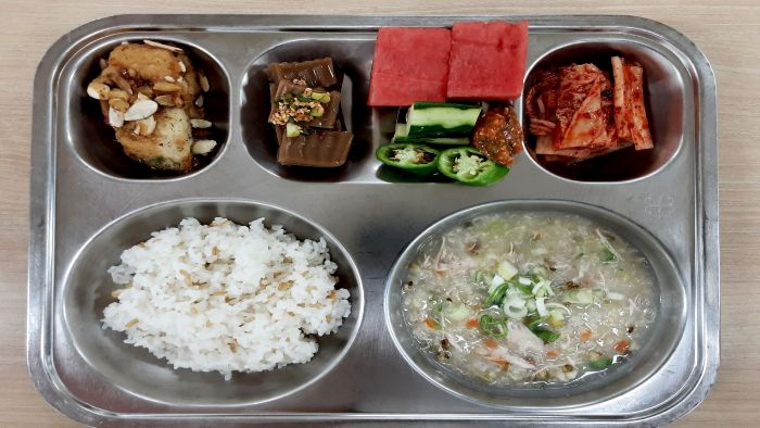 귀리밥* 녹두닭죽* (13.15)허니버터삼치구이(다채롭3-초) (2.5.6.13)수박* 배추김치* (9)도토리묵/양념장* (5.6.13)자율-아삭고추,오이/쌈장 (5.6)