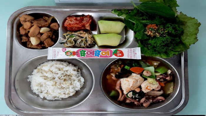 돈육애새송이장조림* (5.6.10.13)숙주쑥갓나물* (5.6)머스크멜론* 짜먹는요구르트(딸기맛) (2)배추김치* (9)찰보리쌀밥* 자율-모듬쌈/쌈장* (5.6)짬뽕순두부국* (5.6.9.13.17)