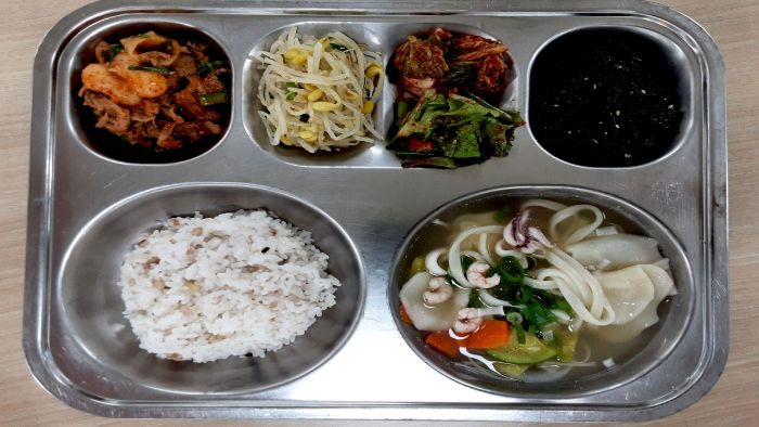혼합잡곡밥 (5)해물칼제비국* (5.6.9.13.17.18)콩나물무침* (5)건파래자반* (13)자율-상추겉절이 (5.6.13)오리고기도라지볶음* (5.6.13)배추김치* (9)