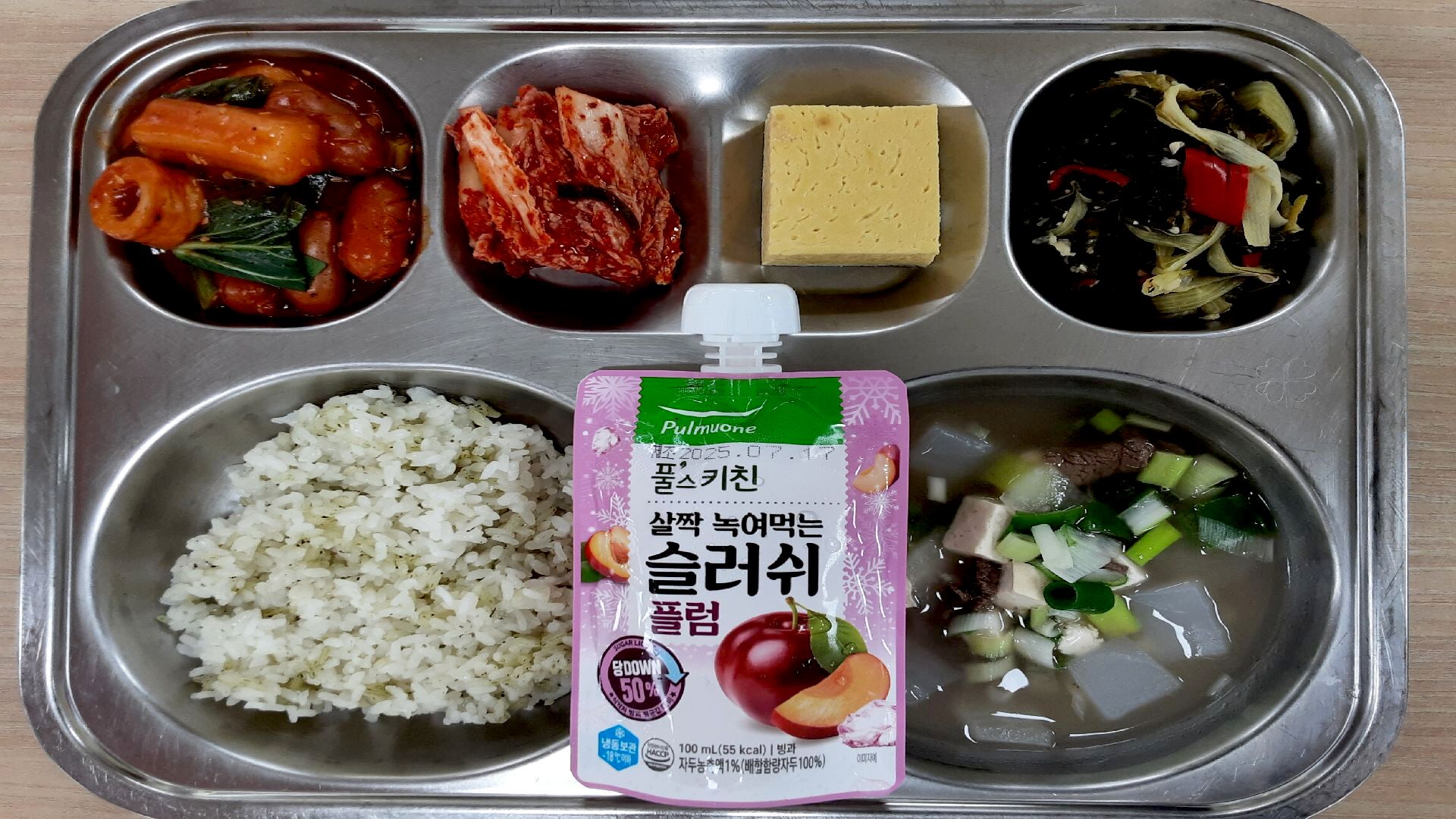 연잎쌀밥 소고기청포묵국* (5.6.9.16.18)푸딩계란찜* (1.2.9)마라떡볶이* (1.5.6.10.12.13.15.16.18)슬러시(자두맛) 배추김치* (9)자율-단배추된장조림* (5.6)