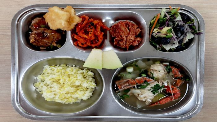 강황밥* 꽃게탕* (5.6.8.9.13.18)진미채볶음* (1.5.6.13.17)자율-양상추블루베리샐러드/소스 (1.5.13)수제함박스테이크/소스* (1.2.5.6.10.12.13.16)머스크멜론* 고로케(별) (2.5.6)배추김치* (9)