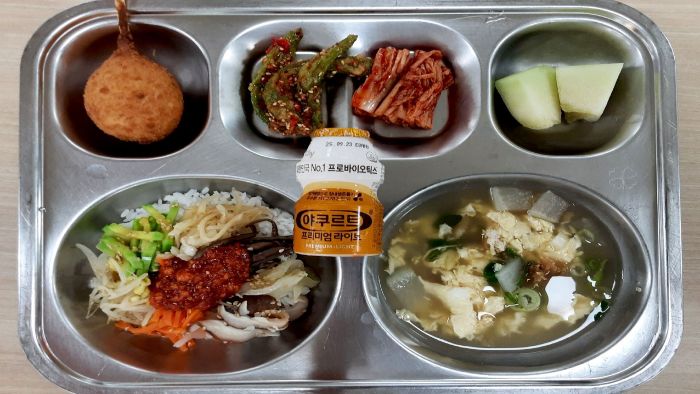 비빔밥/두부약고추장* (5.6.13)북어채계란국* (1.5.6.9)머스크멜론* 요구르트 (2)더블치즈핫도그* (1.2.5.6)배추김치* (9)자율-꽈리고추찜 (5.6)