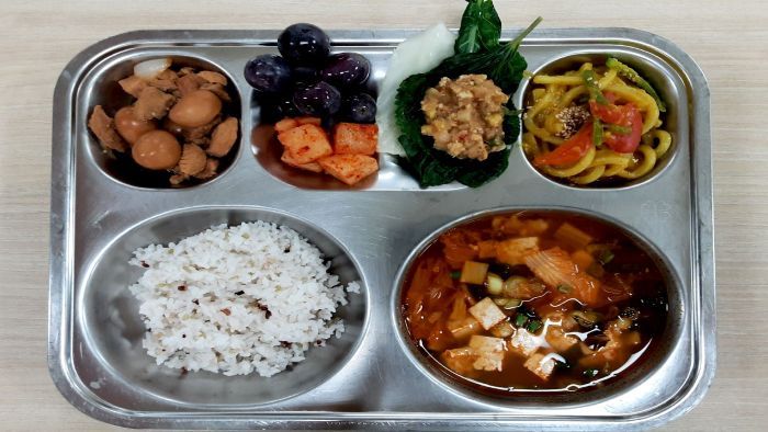 오색발아현미밥* 참치김치찌개* (5.6.9)돈육메추리알장조림* (1.5.6.10.13)카레볶음우동* (2.5.6.10.12.13.16.18)깍두기* (9)거봉*