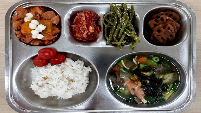 만두국(삼색뜨더기)* (1.2.5.6.9.10.16.18)연근조림* (5.6.13)구슬치즈닭갈비(감성-초9)* (2.5.6.13.15)자율-고구마줄기조림 (5.6)대추방울토마토* (12)배추김치* (9)통밀쌀밥* (6)