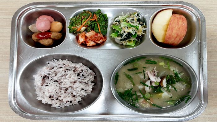 옹심이들깨국* (5.6.9.17)미트볼팝콘치킨오븐구이(케첩) (1.2.5.6.10.12.16.18)숙주청경채무침* (5.6)자율-쌈추겉절이 (5.6.13)배추김치* (9)사과* 검정쌀밥*