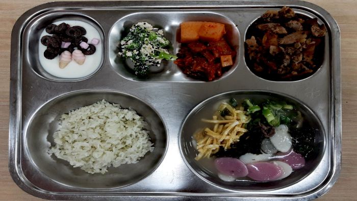 연잎쌀밥 삼색떡국* (1.5.6.9.16)브로콜리두부무침* (5.6)돈육바싹불고기* (5.6.10.13)자율-깍두기 (9)볶음김치* (9.13)플레인요거트/오레오* (2.5.6.10)