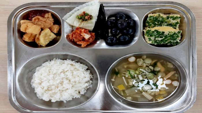 현미밥* 유부장국* (1.2.5.6.9)쵸핑햄계란찜* (1.2.5.6.9.10.15.16)가자미순살강정&고구마튀김* (5.6.12.13)머루포도* 배추김치* (9)자율-양배추,다시마쌈 (5.6)