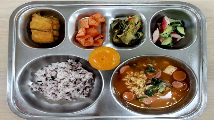 오이맛살새콤무침* (13)부대찌개/라면사리* (1.2.5.6.9.10.13.15.16)깍두기* (9)귤* 검정쌀밥* 삼치순살포카레구이* (2.5.6.12.13.16.18)자율-단배추된장조림* (5.6)