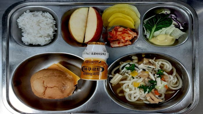 자율-백미밥 유부우동(주식)* (1.5.6.9)자율-양상추샐러드(버거용),배추김치 (1.2.5.6.9)모닝빵버거* (1.2.5.6.10.12.13.15.16)사과* 단무지(얇은)* 저당요구르트(100ml)* (2)