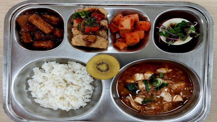 기장밥* 참치김치찌개* (5.6.9)분모자감자조림* (5.6.13.18)수제돈까스/소스* (1.2.5.6.10.12.13.18)깍두기* (9)카프리제샐러드(두루9-초) (2.12.13)골드키위*