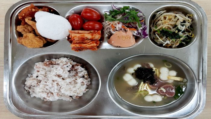 혼합잡곡밥 (5)조랭이하트떡국* (1.5.6.9.16)숙주참나물무침* (5.6)대추방울토마토* (12)자율-양배추샐러드(곁들임) (1.5.12.13)배추김치* (9)순살반반치킨* (1.2.4.5.6.12.13.15.18)
