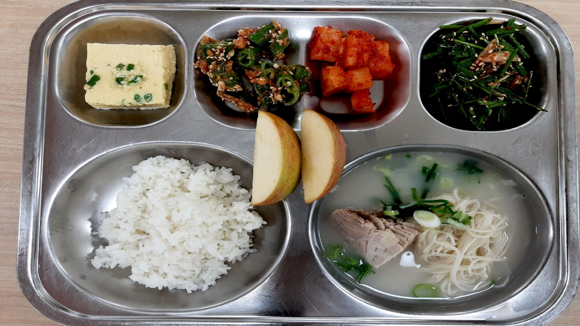 찹쌀밥* 돼지국밥/소면사리* (5.6.9.10)날치알계란찜* (1.2.9)부추겉절이* (5.6.13)깍두기* (9)사과* 자율-아삭고추된장무침 (5.6), 양념장(국밥용) (5.6.9.13)