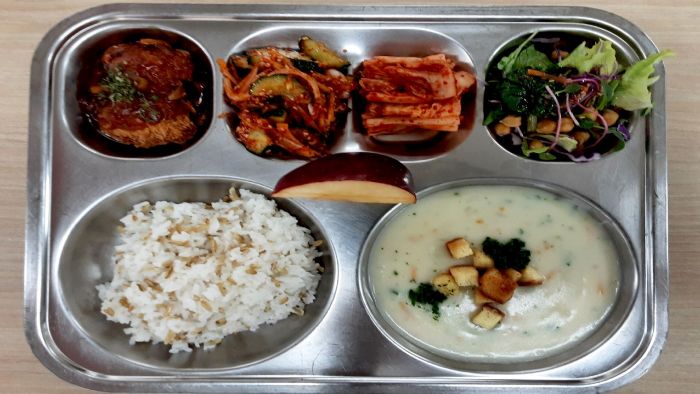 귀리밥* 크림스프/크루통* (2.5.6.13.16)도라지오이무침* (5.6.13)치즈블럭돈까스/소스* (2.5.6.10.12.13)배추김치* (9)사과* 자율-병아리콩양상추샐러드/오리엔탈 (5.6.13)