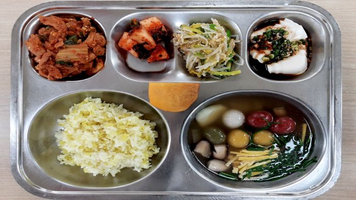 강황밥* 옹심이감자국* (1.5.6.9.18)자율-이색나물* 돈육김치볶음(두루9-초)* (5.6.9.10.13)단감* 알타리김치 (9)연두부찜/양념장* (5.6.13)
