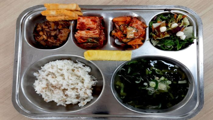 열무된장국* (5.6.9)자율-양상추구슬치즈샐러드/소스 (2.5.6)배오이무침* (5.6.13)수제함박스테이크/소스* (1.2.5.6.10.12.13.16)골드파인애플* 뿌링클막대감자(오븐) 배추김치* (9)통밀쌀밥* (6)
