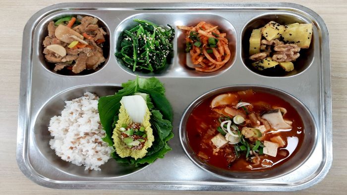 가바쌀밥* 참치김치찌개* (5.6.9)유채나물* (5.6)무생채(신) (13)와인돈육불고기* (5.6.10.13)고구마호두강정(데이9-초) (13.14)자율-모듬쌈/쌈장* (5.6)