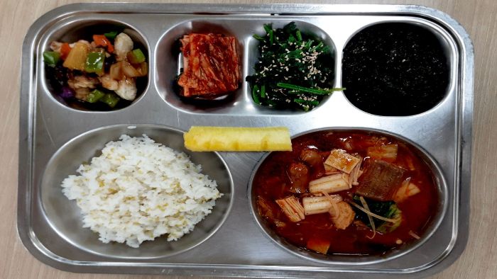 기장밥* 마라탕* (1.2.5.6.10.13.15.16.18)시금치나물* (5.6)건파래자반* (13)골드파인애플* 배추김치* (9)오븐찹쌀탕수육/소스* (1.5.6.10.13)