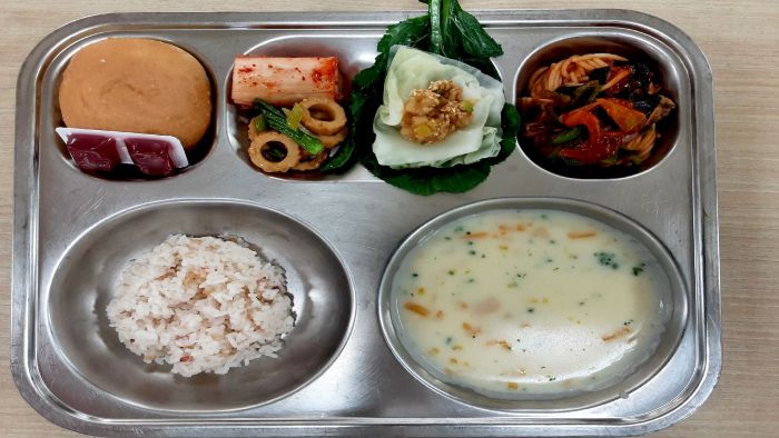 오색현미밥* 단호박크림스프 (2.5.6.13.16)토마토스파게티(다채)* (1.2.5.6.12.13.18)부들어묵꽈리초볶음 (1.5.6.13.18)우리밀모닝빵&딸기쨈 (1.2.5.6.13)배추김치* (9)자율-양배추,케일/강된장 (5.6)