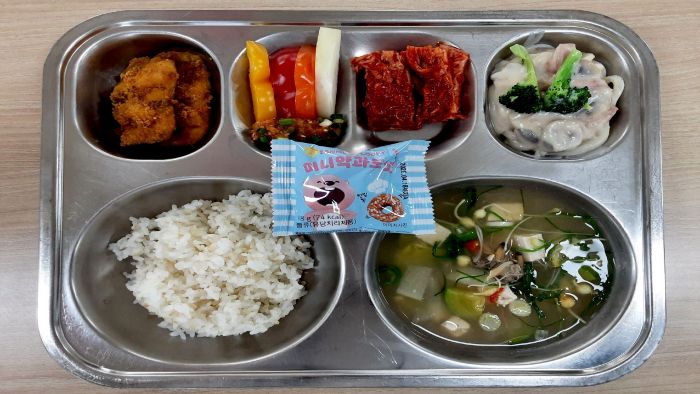 찰현미밥* 크림우동볶음 (2.5.6.10.13.16)달래된장국* (5.6.9.18)약과도넛(미니)* (1.2.5.6)배추김치* (9)삼치순살포카레구이* (2.5.6.12.13.16.18)자율-콜라비,파프리카/쌈장 (5.6)