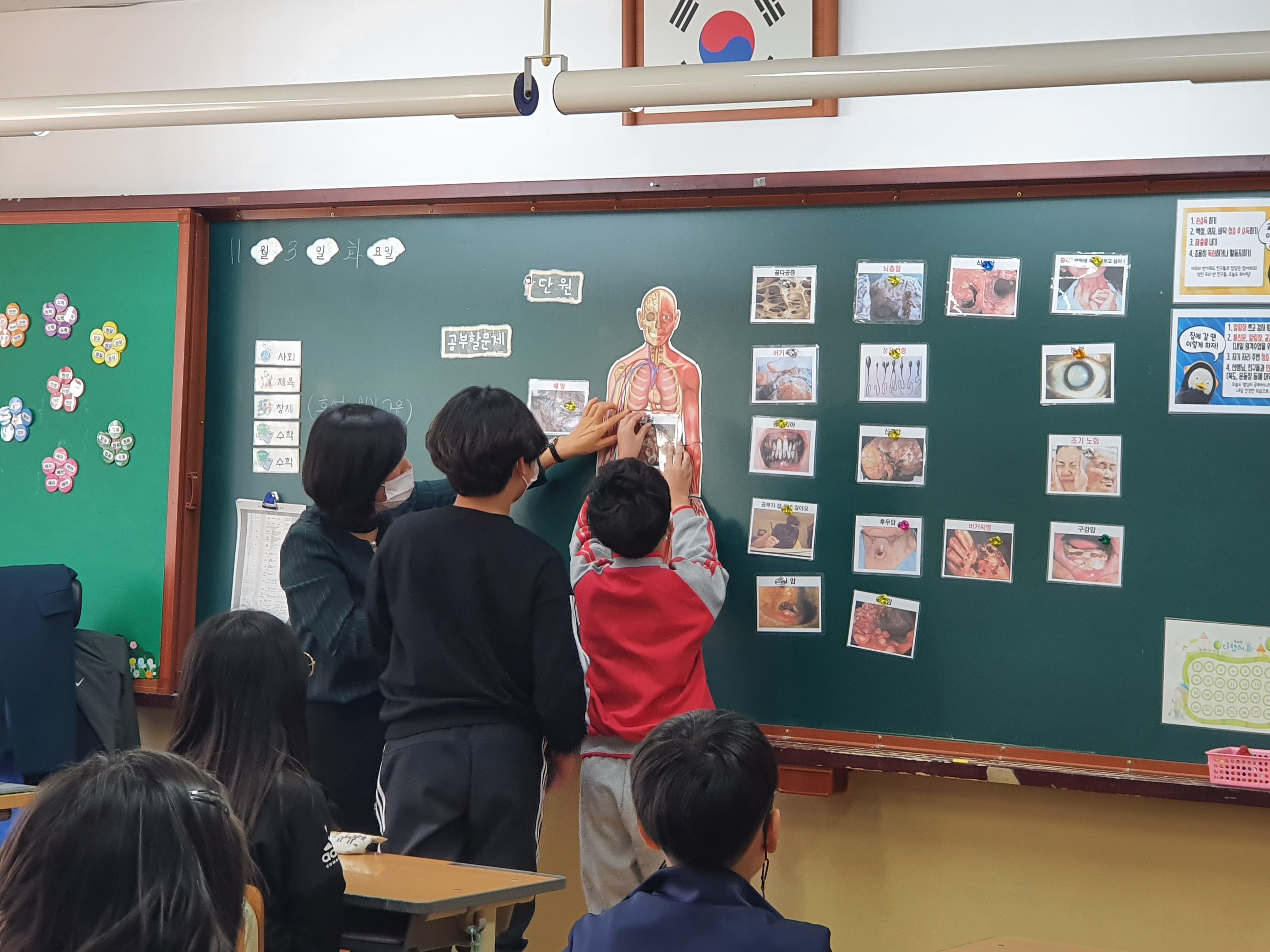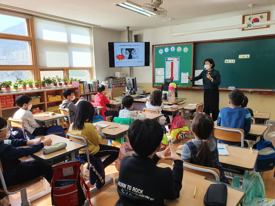 1. 교육일: 1학년(10월 29일, 30일), 3학년(10월 23일, 24일), 5학년(11월 3일, 4일) 2. 교육 방법: 흡연예방 교육 전문 강사를 초빙하여 각 반에서 교육 실시