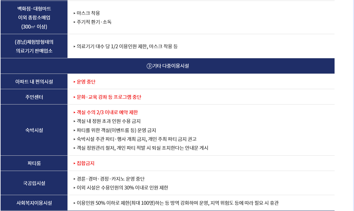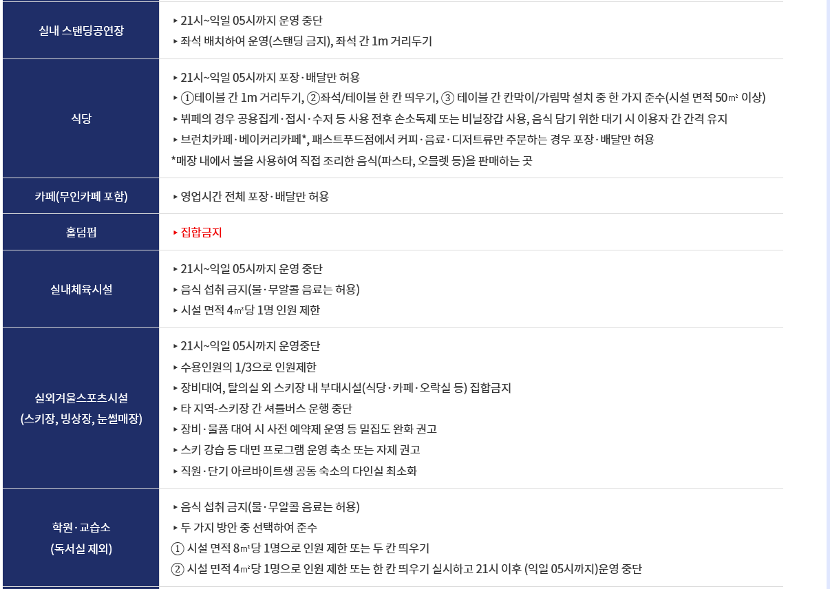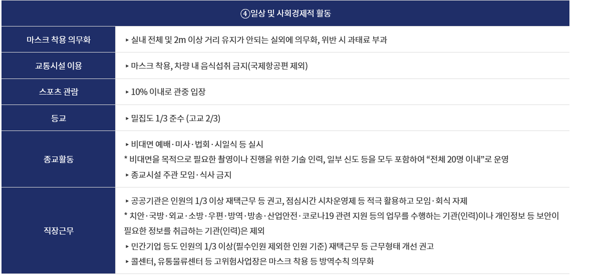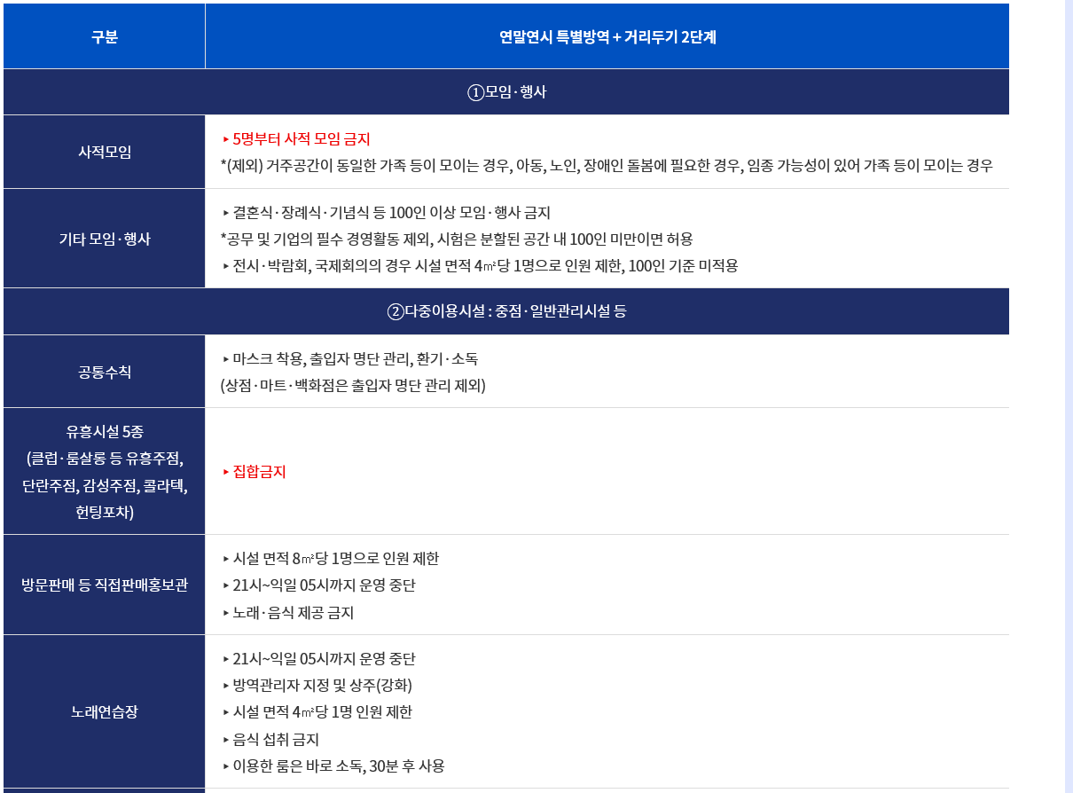 중앙재난안전대책본부에서는 그간 수도권 외 지역에 적용되고 있던 2단계조치와 연말연시 대책을 조정하여 연장(1월4일 0시~1월17일 24시)하기로 결정하여, 이에 수도권 외 지역의 다중이용시설 등에 대한 방역 조치사항을 알려드립니다.