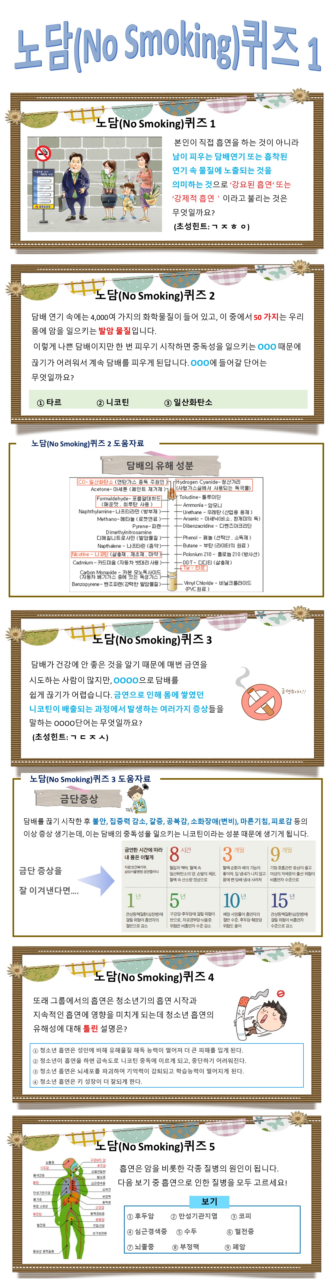 노담퀴즈 정답 1. 간접흡연, 2. ②번, 3. 금단증상, 4. ④번, 5. ①,②,④,⑥,⑧,⑨