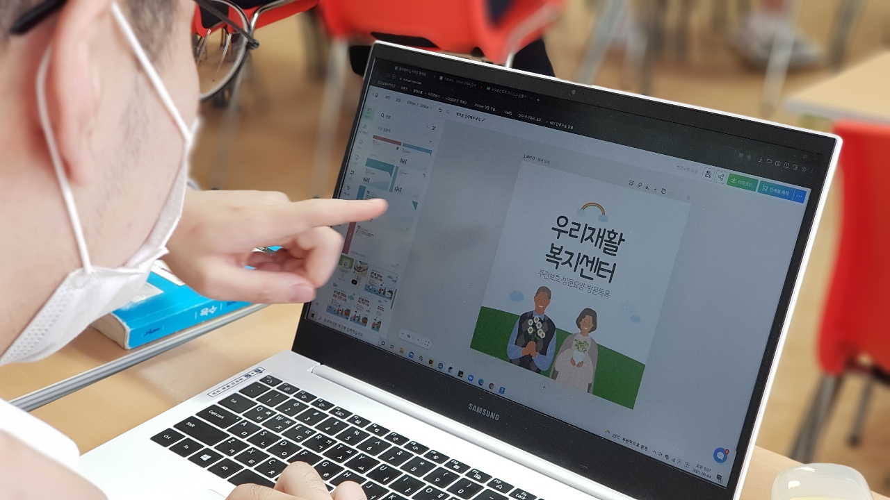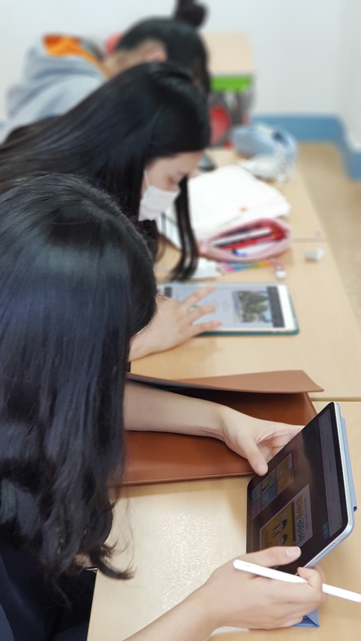 각자 발표한 내용을 학생들이 한눈에 보기 편하게, 카드뉴스로 정리하는 모습입니다