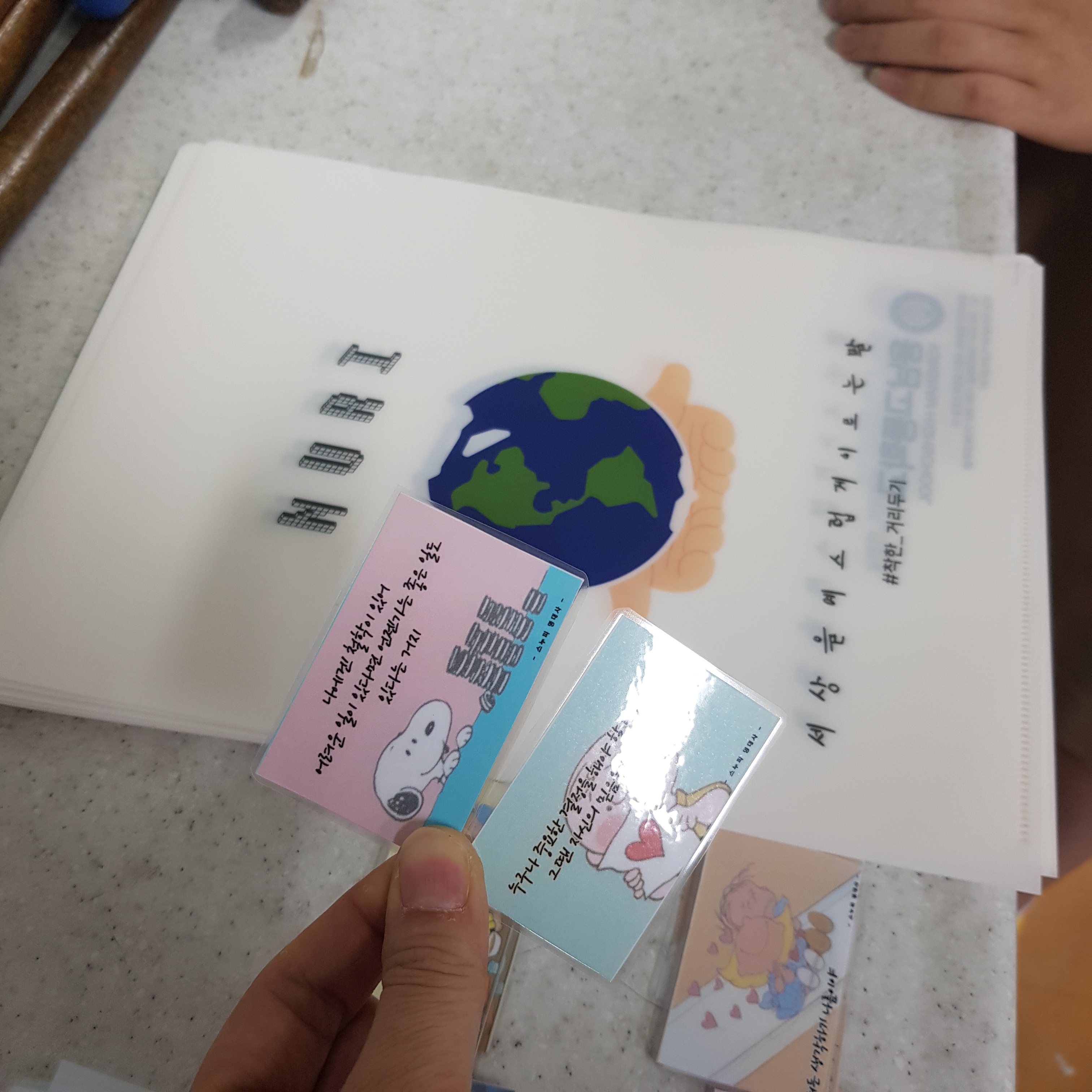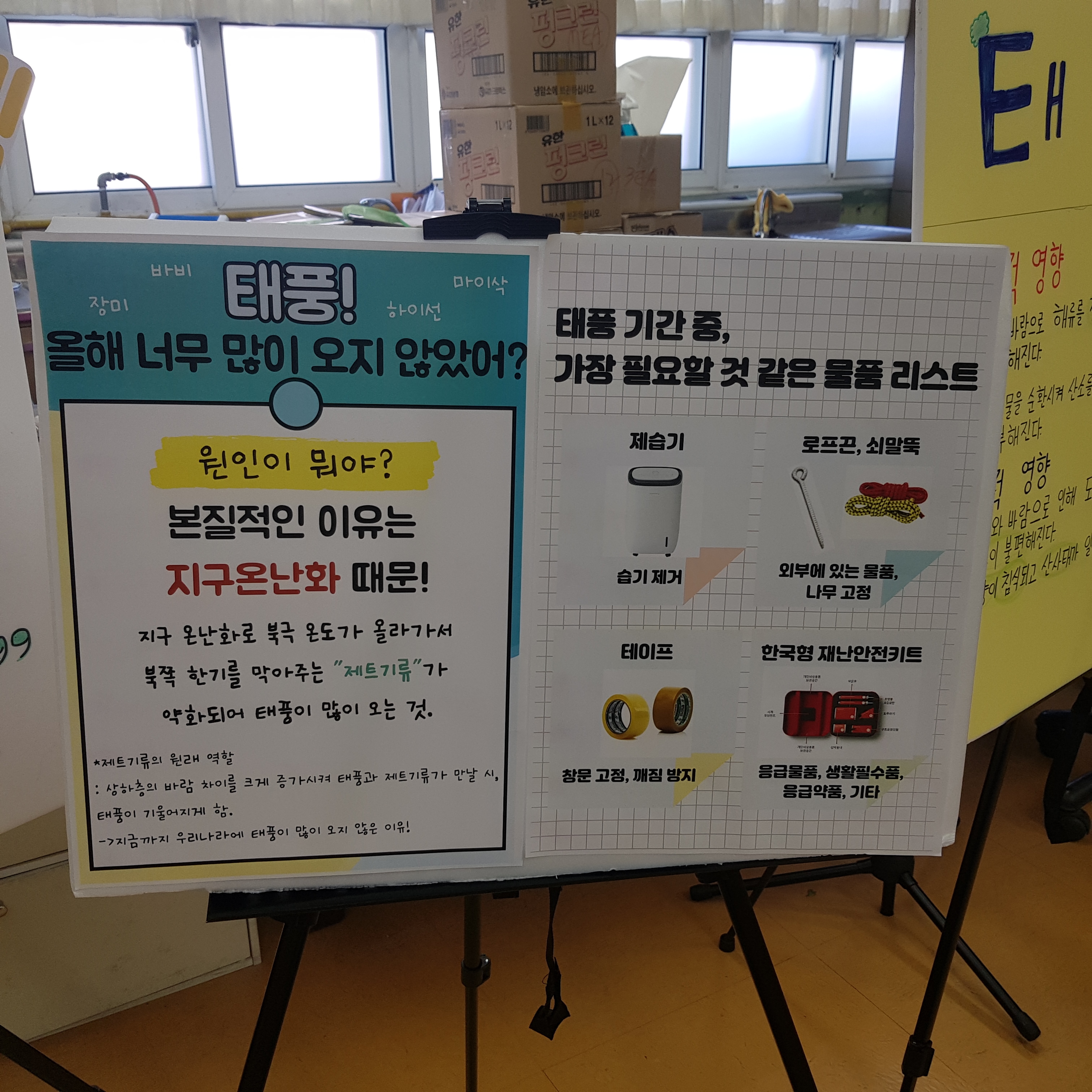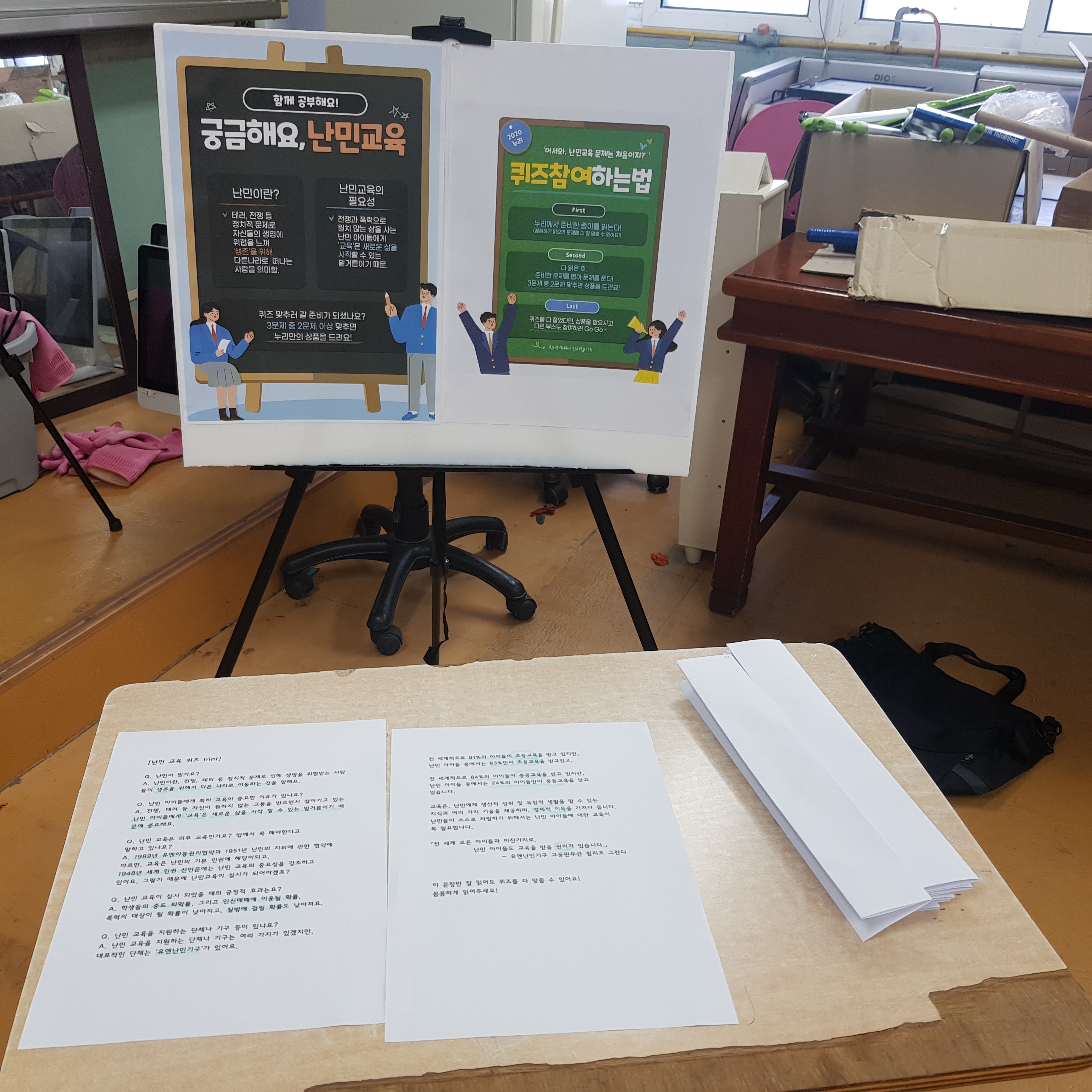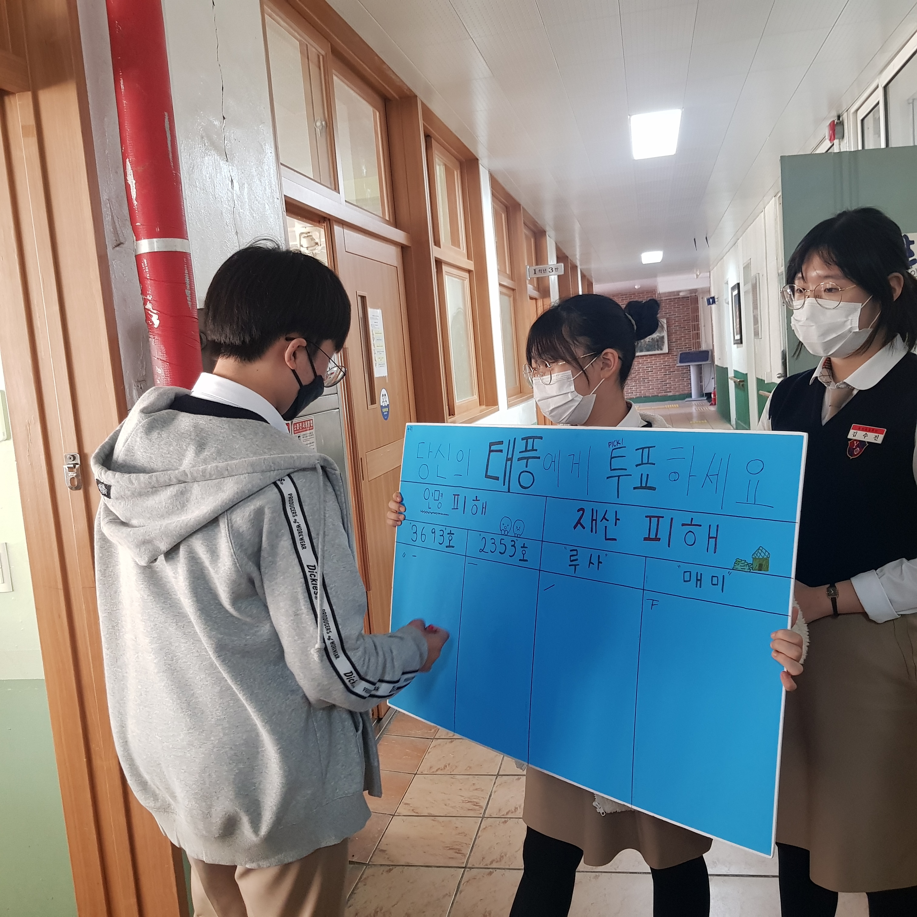 크게 태풍, 인권, 난민교육 3가지로 나누어 태풍이 올 시 필수품 (창업 아이템), 태풍 순위 맞추기, 난민교육 퀴즈, 청소년 자살(스트레스 요인을 적고 위로의 글이 적힌 책갈피 받아가기) 학생들이 즐겁게 참여할 수 있는 캠페인을 진행하였습니다.