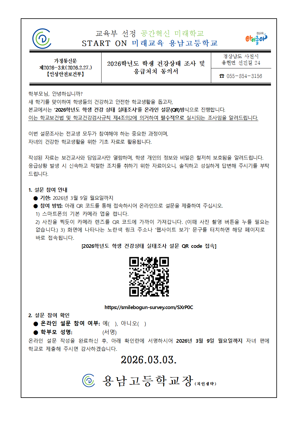 [2026-3호] 2026 학생 건강조사 및 응급처치 동의서