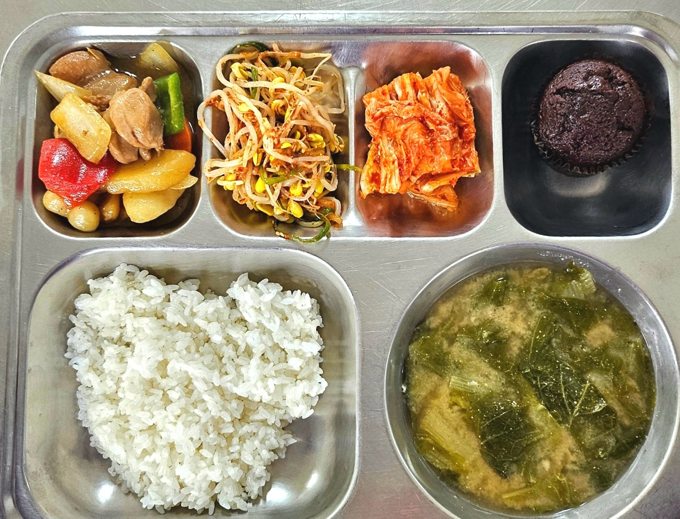 [조식] 친환경찹쌀밥,단배추들깨국,닭살간장조림,콩나물파채무침,배추김치,초코가득컵케이크