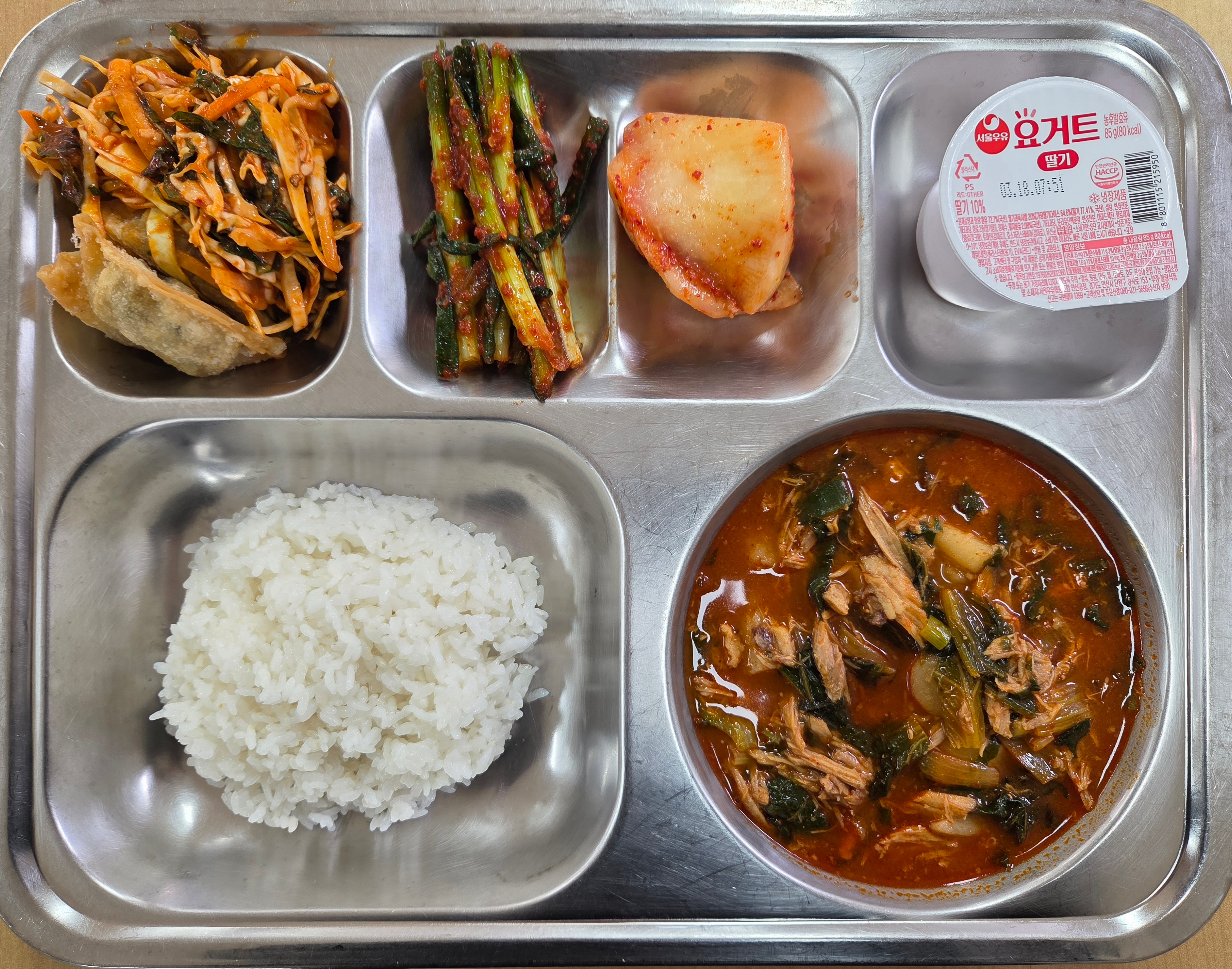 [석식] 친환경찹쌀밥,남다른순살감자탕,비빔만두,파김치,섞박지,딸기요거트