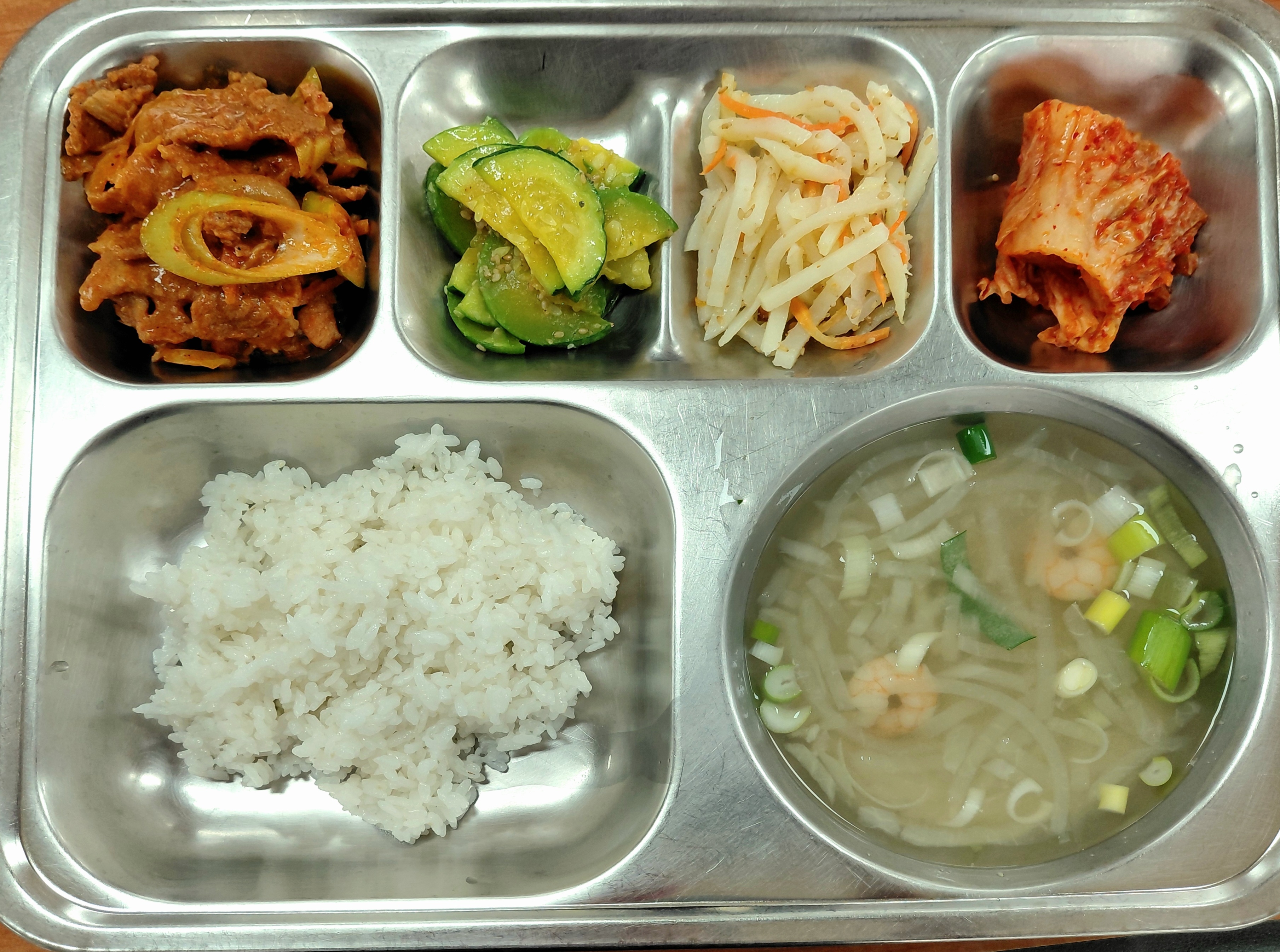 [조식] 친환경찹쌀밥,새우살무채국,제육볶음,감자채볶음,애호박나물(자율),배추김치