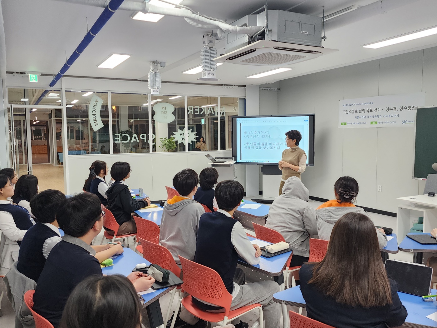 o 학교특색사업으로 인문학적 소양 함양을 위한 강연으로 인문학 시리즈 마지막 세번째 강연으로 고전소설 '정수경정수정전'을 통해 삶의 목적 찾아보기 강연을 진행하였습니다.